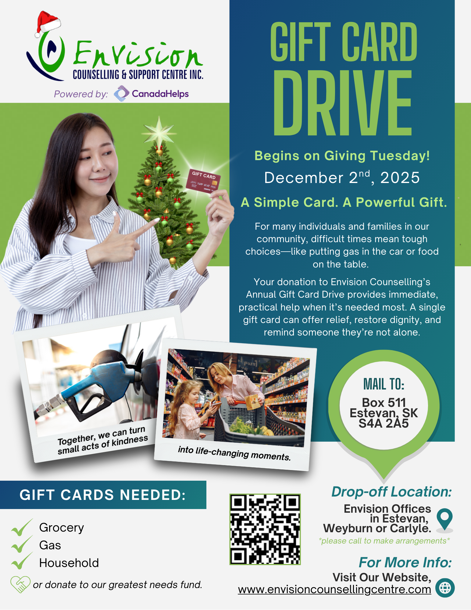 1. Gift cards can be dropped off at Envision Counselling offices in Estevan, Weyburn, or Carlyle.